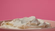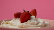 Studio shooting, high speed shooting - Several strawberries falling on cream cheese in pink background - HD Bildbanksvideo