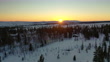 Flying over cabins in Trysil Kunts Fjellverden towards the sunset