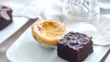 Slow motion CU panning right Camera and selective focus with color grading. Use for background clip or insert shot of Egg tart and Chocolate cake in the white dish.