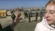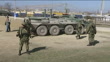 Conflict: Tensions in Crimea; UKRAINE: Crimea: Simferopol:EXTRussian armoured vehicle blocking road to Ukrainian army baseRussian soldiers in road, awaiting ordersRussian soldier alongRussian soldier holding rifle and ammunitionFeodosia (Feodosiya):GV Pro-Russian supporters gather, holding Russian flag Vox pops local woman (translated) SOTBakhchisarai (Bakhchysarai):Armed Russian soldiers on guard outside Bakhchisarai marine engineering baseBV Russian soldier talking to two women on swings Armed Russian soldier sleeping beside tree Ukrainian soldiers (trapped inside base) peering through metalwork of gates Two Russian soldiers on guard PULL OUT to reporter to camera Ukrainian soldier on duty inside base (seen through fence) ZOOM INTRACKING SHOT past soldiers GV Back wall of base with Ukrainian soldier (on top of wall) chatting to a friend Ukrainian soldiers seen through gateLt Col Vladimir Dokuchaev (Bakhchysarai Marine Engineering Base) coming out and shaking hands with reporterLt Col Vladimir Dokuchaev (Bakhchysarai Marine Engineering Base) interview (translated) SOT- we swore on oath to the people of Ukraine and we will keep to that / we are tasked to protect our arms and supplies from any outsiders whoever they may represent Q: Russians say you must lay down your weapons and join their side - will you resist?Lt Col Vladimir Dokuchaev SOT- No, why? They are very peaceful towards us / they are not aggressive and we are not responding with aggression / we are continuing a dialogue with them Lt Col Igor Bagratyn (Bakhchysarai Marine Engineering Base) (translated) SOT- We're not talking about attacks, it's going peacefully / we are communicating with them Reporter shaking hands with officers Soldier closing gates of base