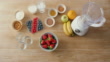 Top view of fresh strawberries, banana, green apple, almonds, and curd, alongside blender for making a healthy smoothie. A healthy dieting and nutrition, alkaline, vegetarian and health concept