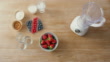 Top view of fresh strawberries, banana, green apple, almonds, and curd, alongside blender for making a healthy smoothie. A healthy dieting and nutrition, alkaline, vegetarian and health concept - 4K Bildbanksvideo