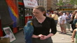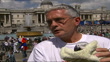 World Parrot Day: Trafalgar Square event; ITNENGLAND: London: Trafalgar Square:EXTTGV Trafalgar Square TILT DOWN crowd of people gathered for World Parrot Day event CMS Blue parrot on man's shoulder as girl feeding parrot PAN Basket of nibbles held TILT UP red & green parrot being fed'Born to be wild' sign TILT UP men posing with parrot figureRed parrot biting camera tripodMS Illustrator Quentin Blake sketching parrot as red & green parrot perched on his shoulderCMS Sketch pad held as Blake drawing parrot(World Parrot Day GVs= 30 secs)Quentin Blake (Illustrator) interviewed SOT- Discusses World Parrot TrustCMS Blue & yellow parrot i/cMS Alan Jones (Chairman, Parrot Society UK) holding parrot in fleecy blanket as sitting on open-topped busCS Parrot in blanketAlan Jones (Chairman, Parrot Society UK) interviewed SOT- Parrots are still being taken from wild at an alarming rate, and although their habitat is being detsroyed, taking them from it is not the way to go'Save the parrots' petition Parrot enthusiasts marching along on journey to Downing Street to hand in petition (2 SHOTS)