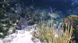 Turtle Swims toward camera, then by the camera along reef, porkfish in background. Key Largo, Florida Keys. - HD Bildbanksvideo