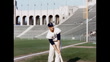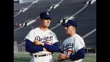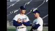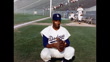 Two adult Caucasian male Los Angeles Dodgers players chatting with each other. Wally Moon performing standing stretches. Don Demeter hitting grounders. Catcher Johnny Roseboro catching.
