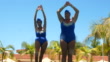 MS View from water of senior female synchronized swimmers diving into pool during routine - 4K Bildbanksvideo