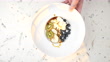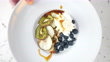 Using whipping siphon to dispense whipped cream on top of yogurt dessert. Pouring maple syrup as finishing touch. Mixture of plain yogurt with oat flakes covered with fresh blueberries and dried kiwi fruit, dried conference pear chip and dried banana chip. High point of view.