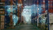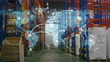 World map with logistic network distribution on Camera moving between shelves in Warehouse interior.logistic and transportation technology concept.