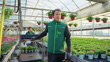 SLO MO Young Greenhouse Workers Pushing Cart with Ornamental Plants at Workplace - 4K Bildbanksvideo