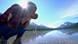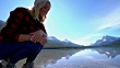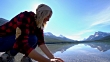 Blond girl drinking fresh water from mountain lake in Banff national park, Alberta, Canada. People travel nature environment concept- 4K
